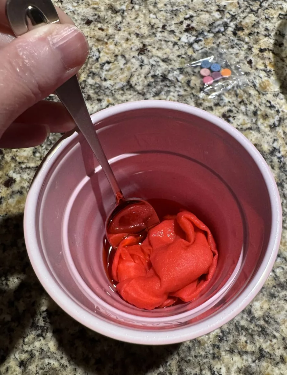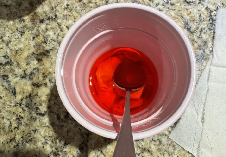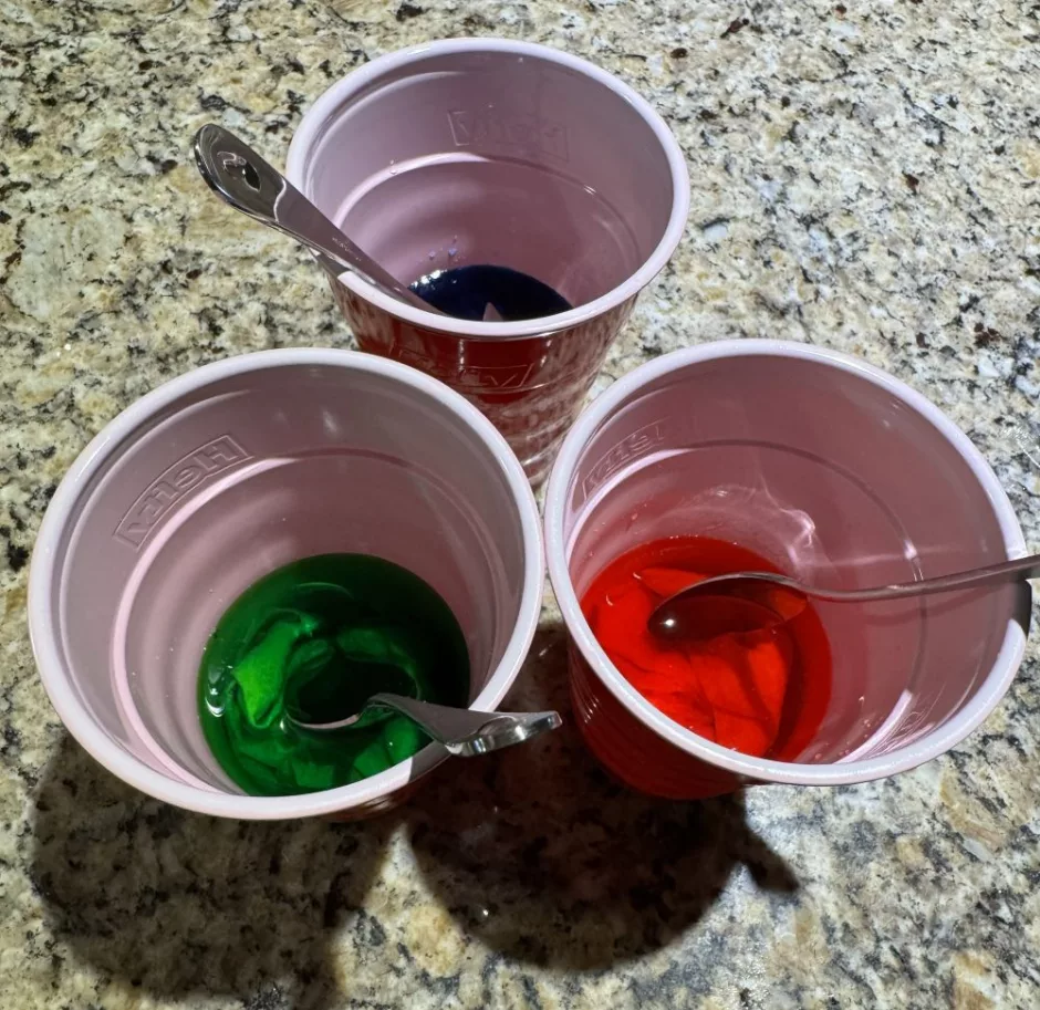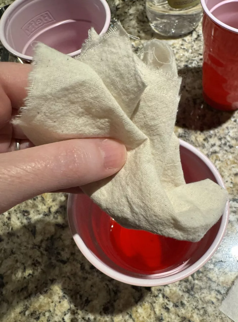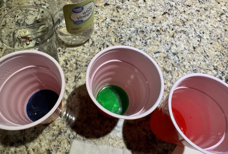 I used disposable cups to dissolve my dye. You’ll also need some vinegar and water, and a spoon or several (or craft sticks).