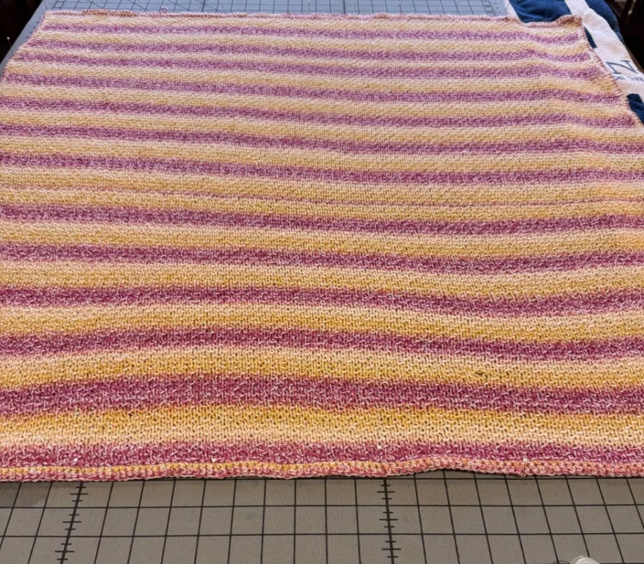 Continue in pattern until your blanket is square. End on either row 2 or row 4 and bind off in knitting. I used a stretchy bind off because the bind off is so long.